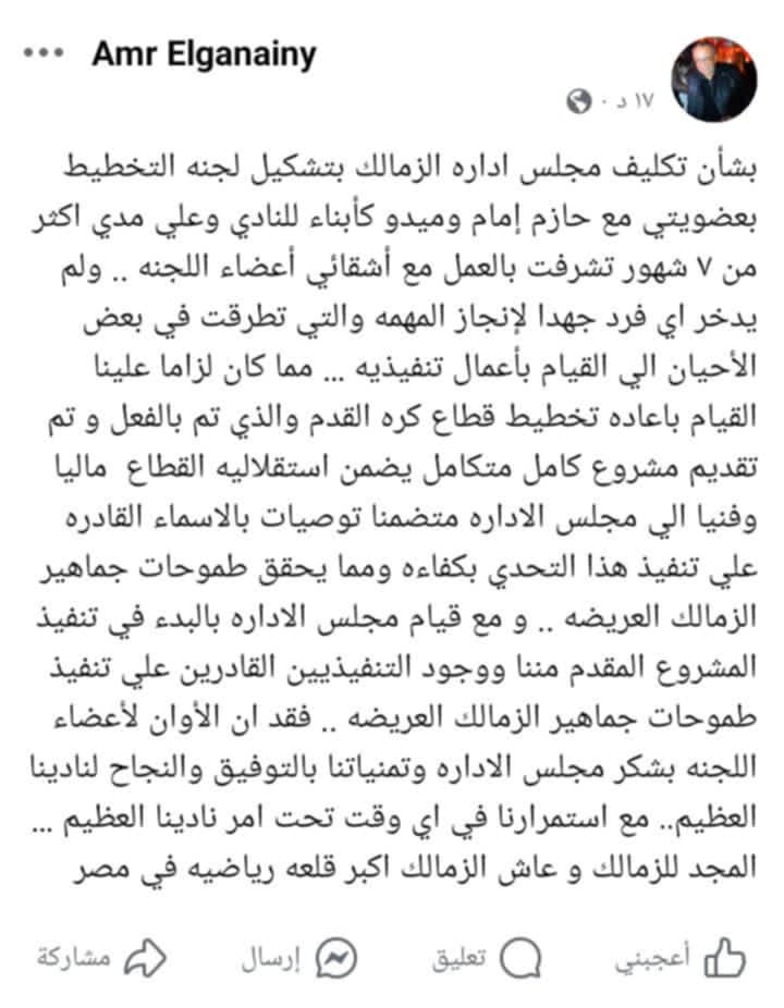 عمرو الجنايني يعلن رحيله رسمياً عن لجنة تخطيط الزمالك.. ويؤكد