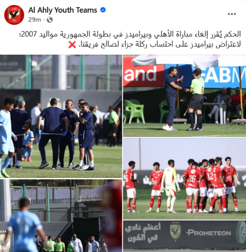 وأعلنت الصفحة الرسمية لقطاع ناشئي الأهلي عبر “فيسبوك” أن الحكم اتخذ قراره بإلغاء المباراة رسميًا، مؤكدة أن السبب هو اعتراض بيراميدز الشديد على ركلة الجزاء التي احتُسبت لصالح الأهلي.