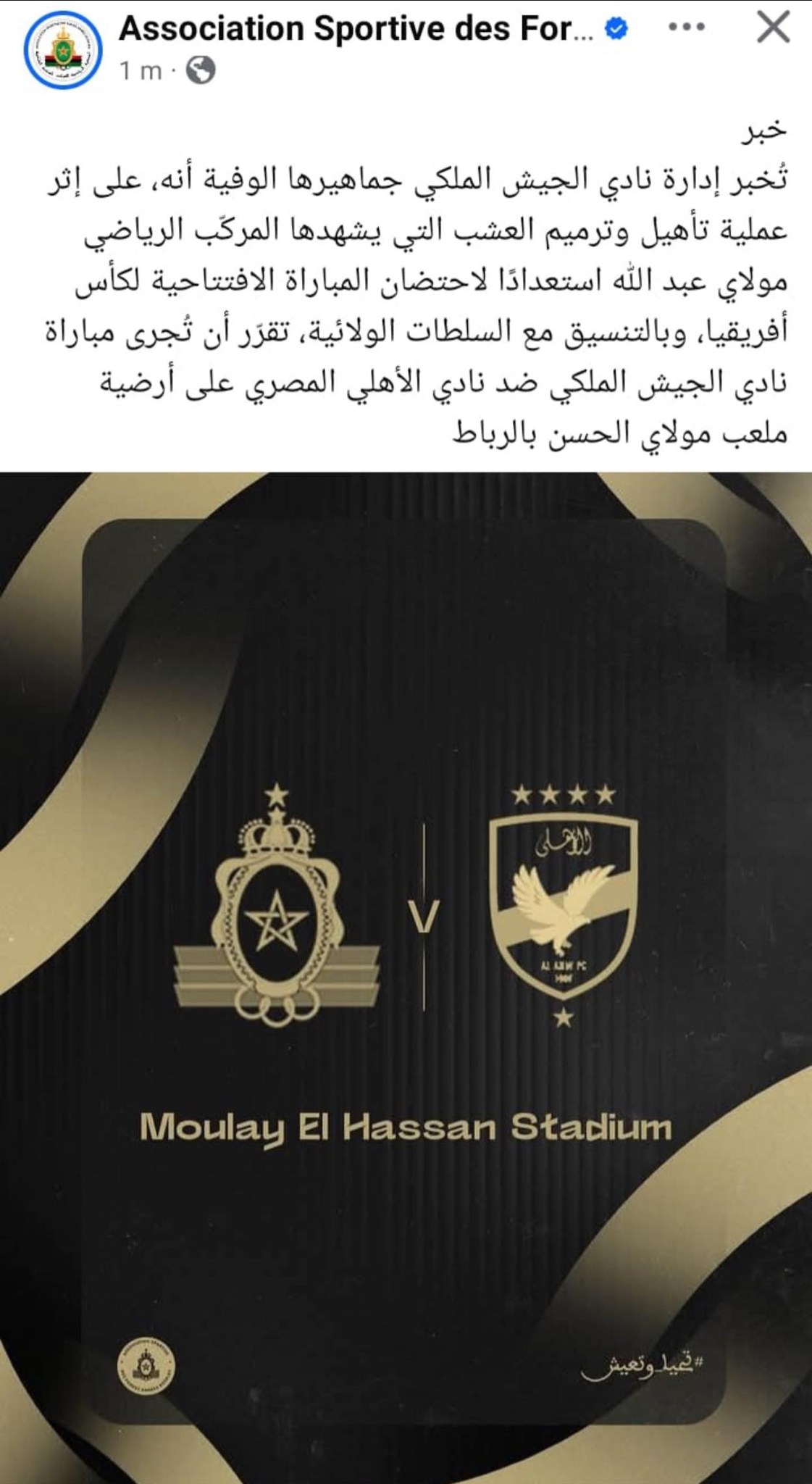 و تابع البيان: “بالتنسيق مع السلطات الولائية، تقرّر أن تُجرى مباراة نادي الجيش الملكي ضد نادي الأهلي على أرضية ملعب مولاي الحسن بالرباط”.
