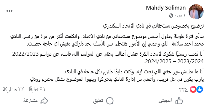 توضيح بخصوص مستحقاتي في نادي الاتحاد السكندري، لقد حاولت طويلاً إنهاء هذا الملف وتواصلت أكثر من مرة مع رئيس النادي محمد أحمد سلامة الذي وعدني بحل الموضوع، لكن للأسف لم يحدث أي تقدم حتى الآن.