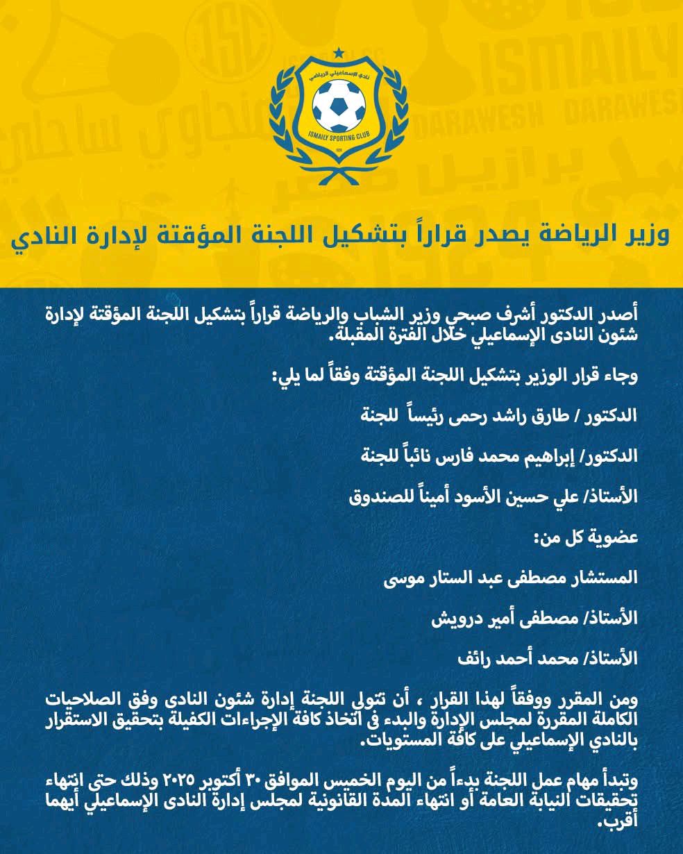النادى الاسماعيلى، أصدر وزير الشباب والرياضة قرار رسميًا بتشكيل لجنة مؤقتة لإدارة شئون نادي الإسماعيلي، تتولى الإشراف على إدارة النادي خلال الفترة المقبلة، وذلك في ضوء التطورات الأخيرة المتعلقة بمجلس الإدارة الحالي واحالته للنيابة، وتجميد المجلس.