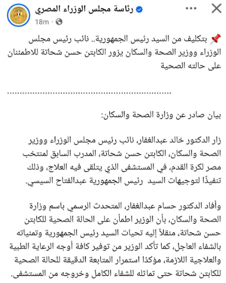 وقد تم نشر بيان رسمي عبر الصفحة الرسمية لرئاسة مجلس الوزراء بشأن الزيارة، تضمن رسالة دعم وتمنيات بالشفاء العاجل لأسطورة الكرة المصرية.