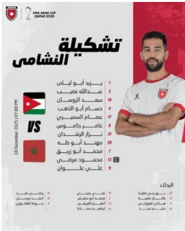 تشكيل الأردن لمواجهة المغرب، أعلن الجهاز لمنتخب الاردن عن تشكيلة النشامى لمباراة المغرب فى مباراة نهائي كأس العرب على الأراضي القطرية.