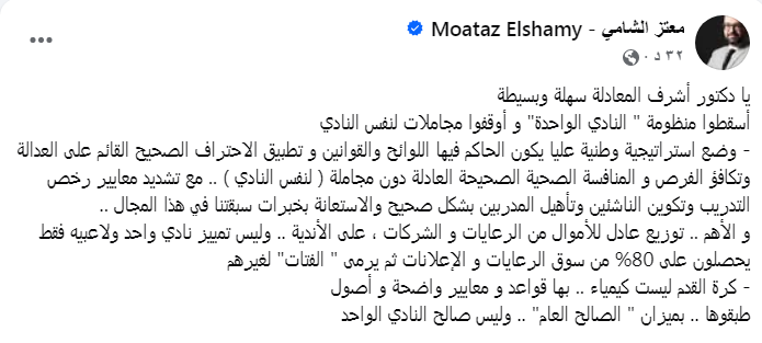 ومن خلال منشور عبر صفحته الشخصية على موقع التواصل الاجتماعي “فيس بوك”، عبر الشامي عن رأيه في الأزمة، مطالبًا الوزير بإصلاح شامل للمنظومة الرياضية المصرية، بعيدًا عن سياسات المجاملة والتمييز لنادٍ بعينه.