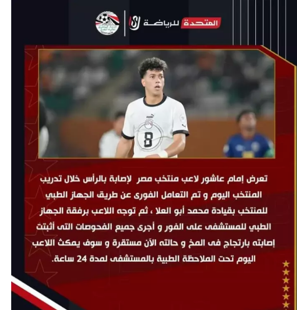 تعرض إمام عاشور لاعب منتخب مصر لإصابة بالرأس خلال تدريب المنتخب اليوم و تم التعامل الفورى عن طريق الجهاز الطبي للمنتخب بقيادة محمد أبو العلا ، ثم توجه اللاعب برفقة الجهاز الطبي للمستشفى على الفور و أجرى جميع الفحوصات التى أثبتت إصابته بارتجاج فى المخ و حالته الآن مستقرة و سوف يمكث اللاعب اليوم تحت الملاحظة الطبية بالمستشفى لمدة ٢٤ ساعة.