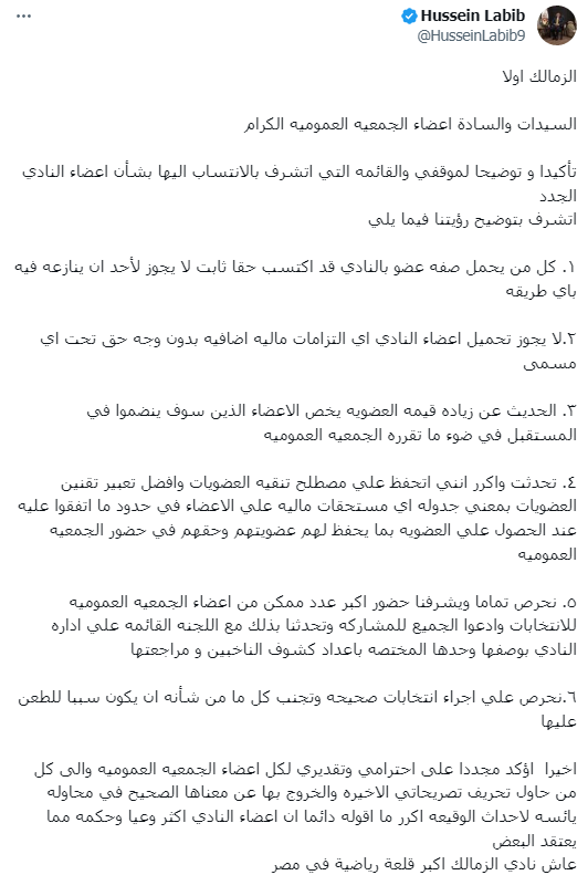 وجه حسين لبيب المرشح على مقعد الرئيس فى الانتخابات القادمة، ورئيس اللجنة السابقة التى كانت تدير النادى رسالة لاعضاء الجمعية بخصوص العضويات التى يتم الحديث عن تنقيتها.