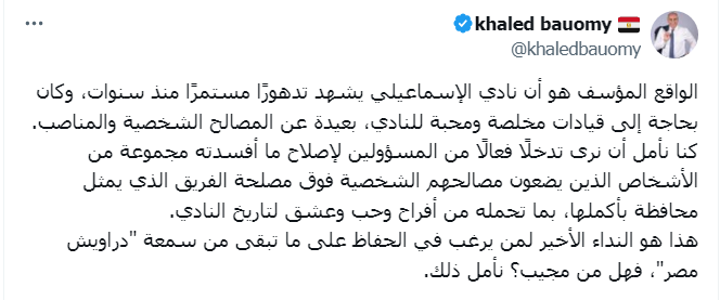 خالد بيومى وعبر صفحته على منصة إكس كتب معلقاً على وضع الاسماعيلى قائلاً