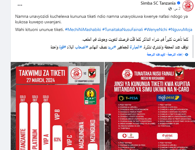 سيمبا التنزاني أشعل حماس جماهيره بشكل كبير وطالبهم بالاسراع على شراء تذاكر المباراة للتواجد في الملعب ودعم الفريق امام الأهلي.
