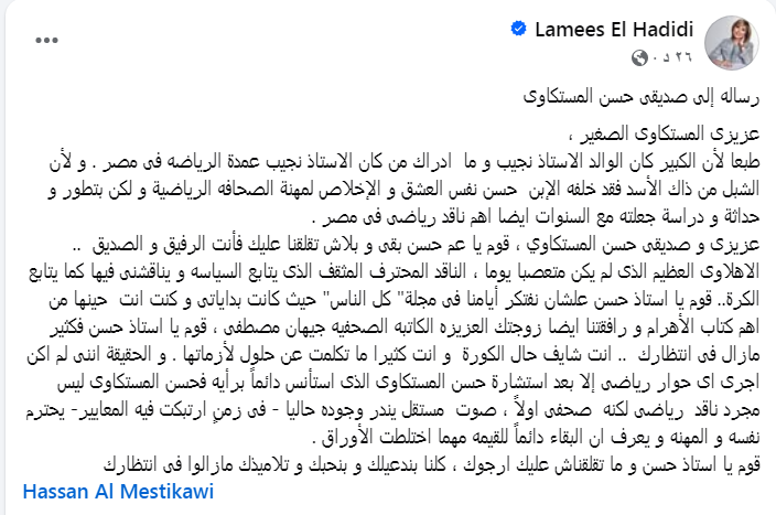 لميس الحديدى وعبر صفحته الشخصية على موقع التواصل الاجتماعى فيس بوك كتبت رسالة دعم لحسن المستكاوى قائله