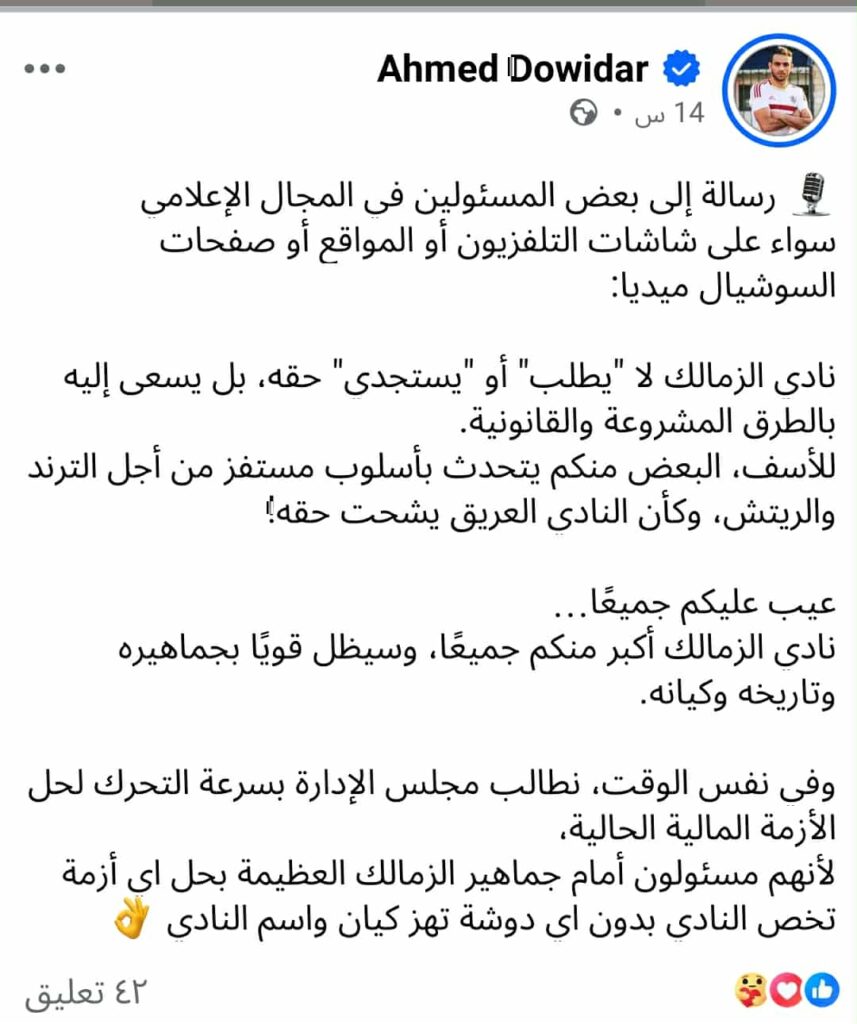 رسالة نارية من أحمد دويدار تعليقاً على ما يحدث في الزمالك