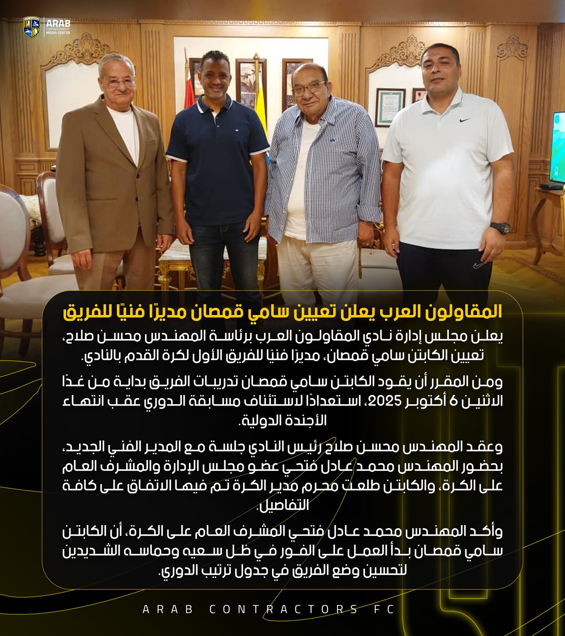المقاولون العرب،أعلن مجلس إدارة نادي المقاولون العرب برئاسة المهندس محسن صلاح عن تعيين الكابتن سامي قمصان مدير فني للفريق الأول لكرة القدم، خلفًا للمدرب السابق محمد مكي.