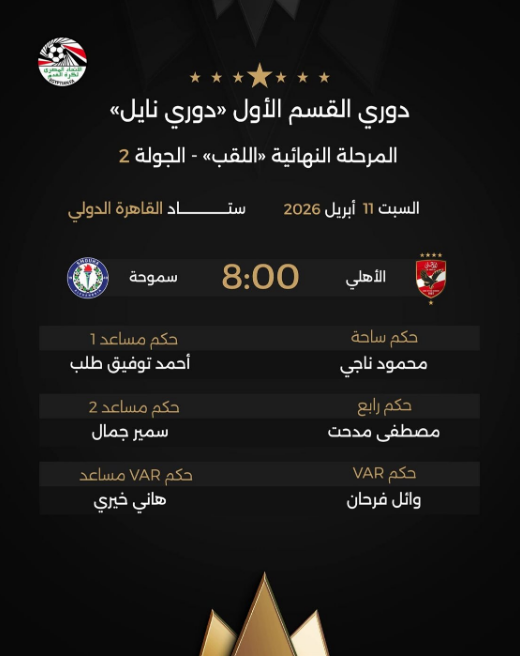 طاقم تحكيم مباراة الاهلى وسموحة، عاجل