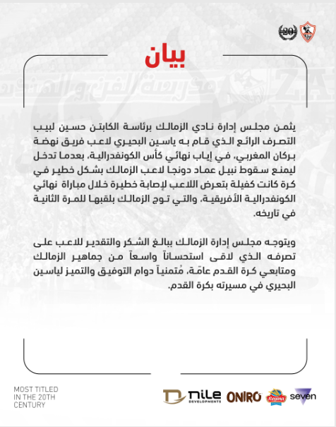 وجاء بيان نادى الزمالك الذى اصدره منذ قليل، ووجه فيه الشكر لـ لاعب نهضى بركان اللاعب ياسين البحيري كالاتى :