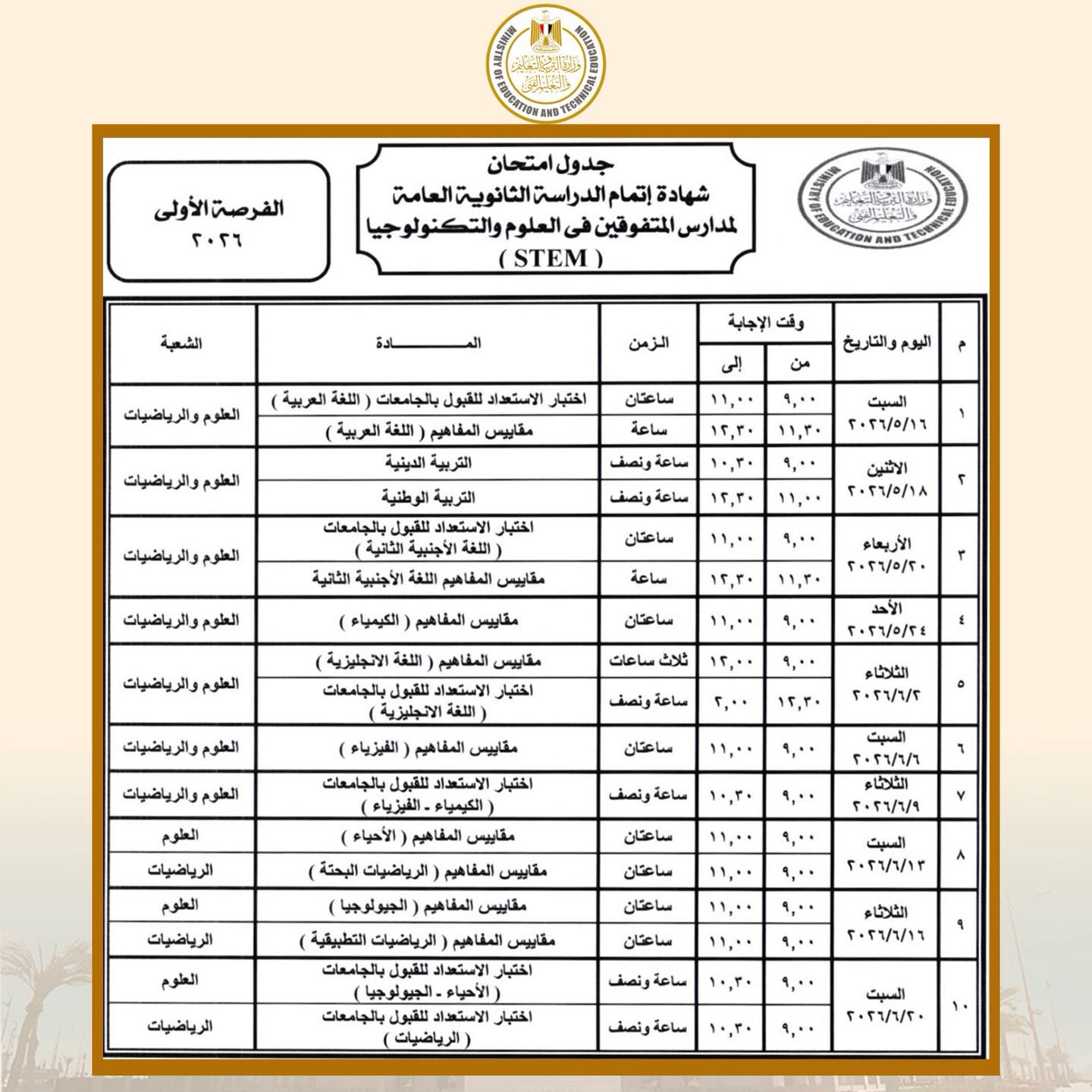 وفيما يخص طلاب مدارس المتفوقين في العلوم والتكنولوجيا (STEM)، فمن المقرر أن تبدأ امتحانات الفرصة الأولى يوم 16 مايو 2026، وتستمر حتى 20 يونيو من نفس العام.