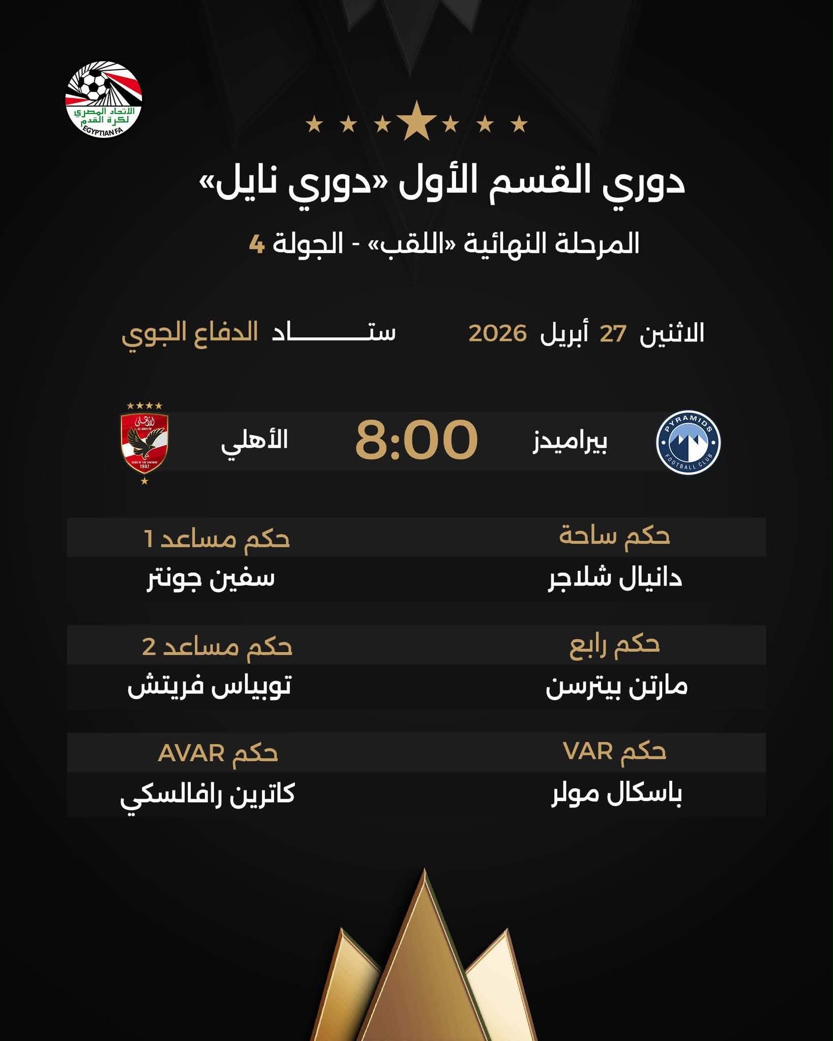 عاجل، طاقم تحكيم مباراة الاهلى وبيراميدز