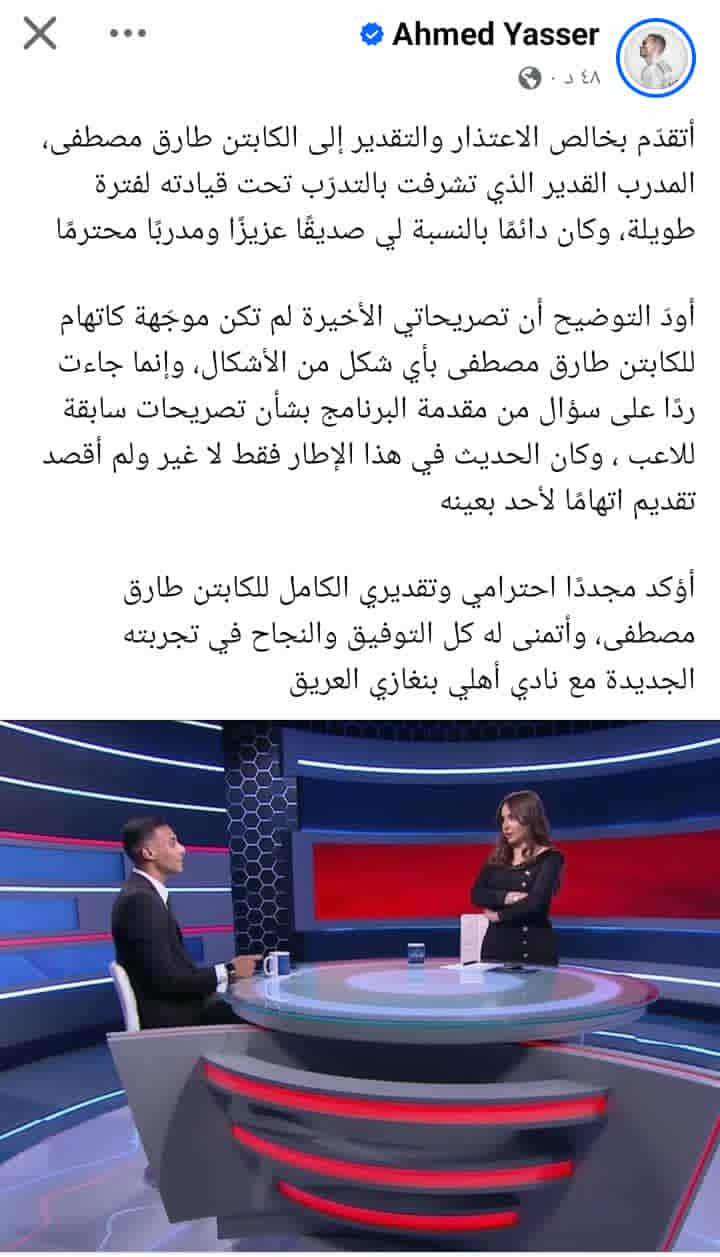 طارق مصطفى، تقدم أحمد ياسر لاعب المصري البورسعيدي السابق، باعتذار رسمي إلى طارق مصطفى، نجم الزمالك الأسبق والمدير الفني الحالي لفريق أهلي بنغازي الليبي.