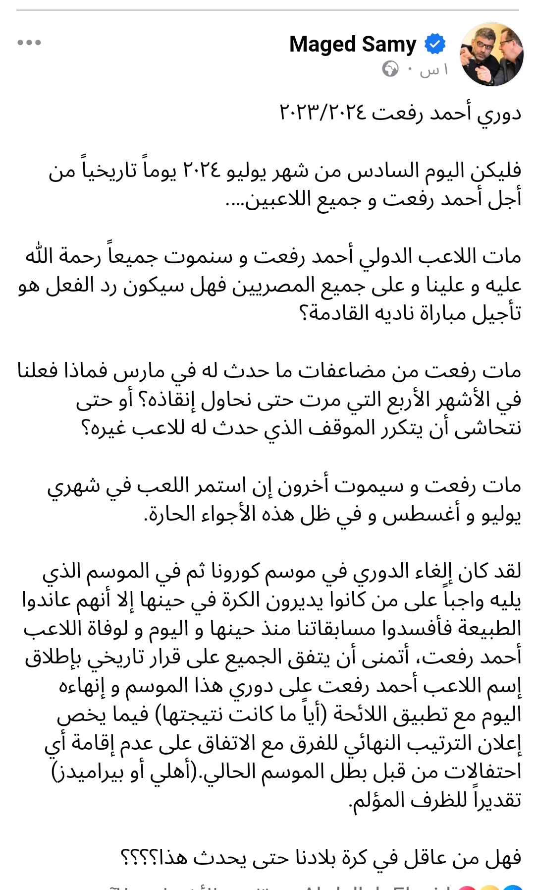واستكمل: «لقد كان إلغاء الدوري في موسم كورونا ثم في الموسم الذي يليه واجباً على من كانوا يديرون الكرة في حينها إلا أنهم عاندوا الطبيعة فأفسدوا مسابقاتنا منذ حينها واليوم ولوفاة اللاعب أحمد رفعت».